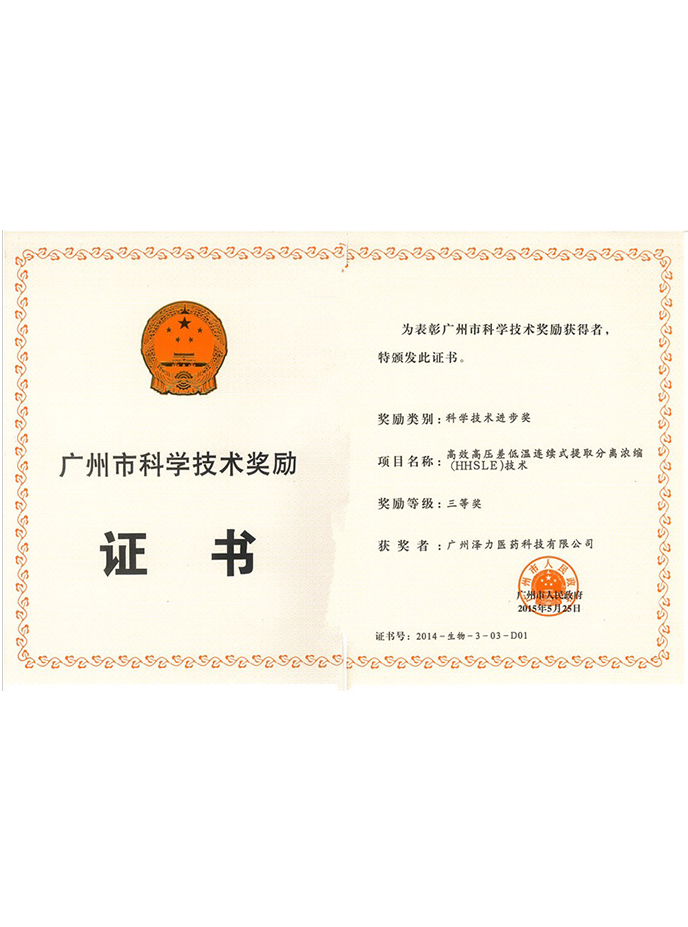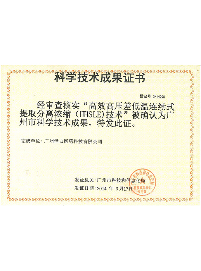 ● 荣获广州市科学技术成果1项:高效高压差低温连续式提取分离浓缩(HHLSE)技术;