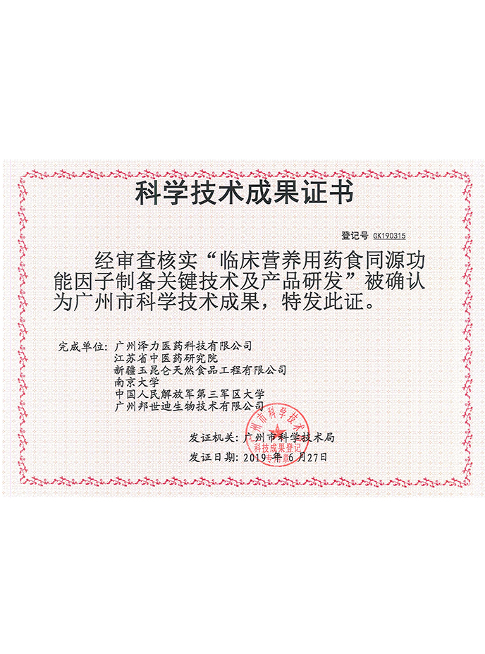 ● 连续式高压差提取分离浓缩设备、高效高压差低温连续式提取分离浓缩技术系列提取物、人参黄精固体饮料、中华辣木、风味低聚果糖、白芪多糖、黄芪多糖颗粒等7款产品被认定为“广东省高新技术产品”;