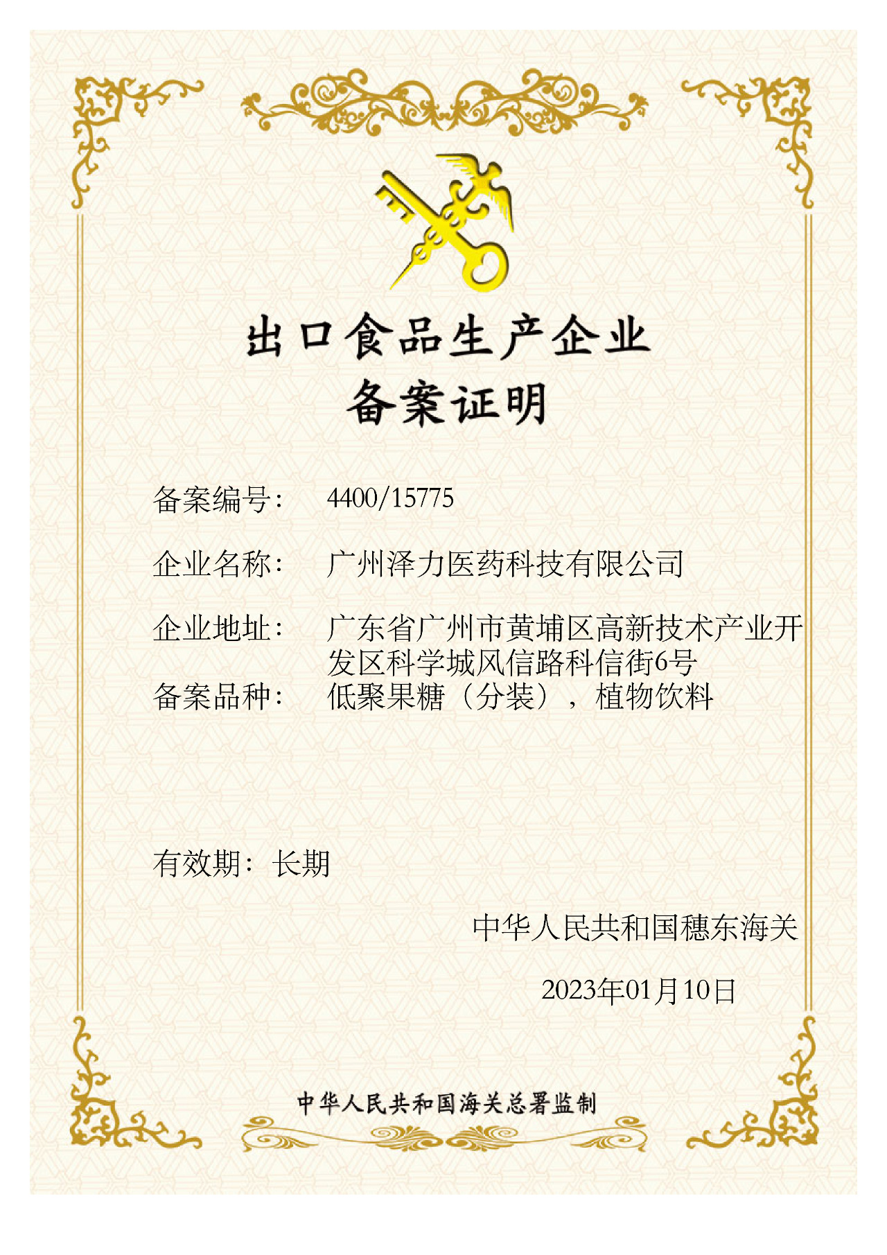 近日,广州尊龙凯时医药科技有限公司获得出口食品生产企业备案证明,为中国食品出口海外,走向世界,贡献自己的一份力量。