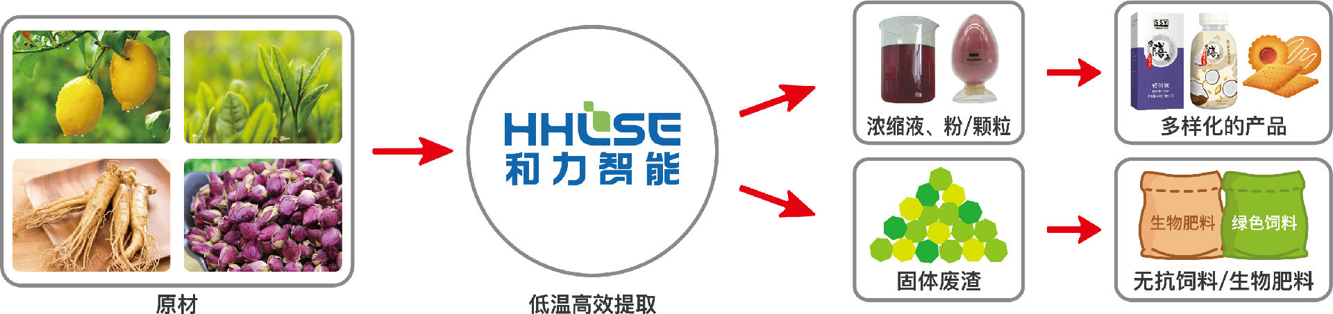 国内首创“和力智能”——农产品精深加工智能移动工厂,和力智能(HHLSE)低温高效提取成套装备由前处理、提取模块、固液分离模块、浓缩模块、制水、废渣处理和控制系统等构成,具备工业4.0时代的自动化、模块化、数字化、标准化、移动化等特征,采用“低温高效提取技术”、“工业模块化+智能移动化+数字化技术”、“无排放清洁生产技术”三大系统工程技术,技术优势明显