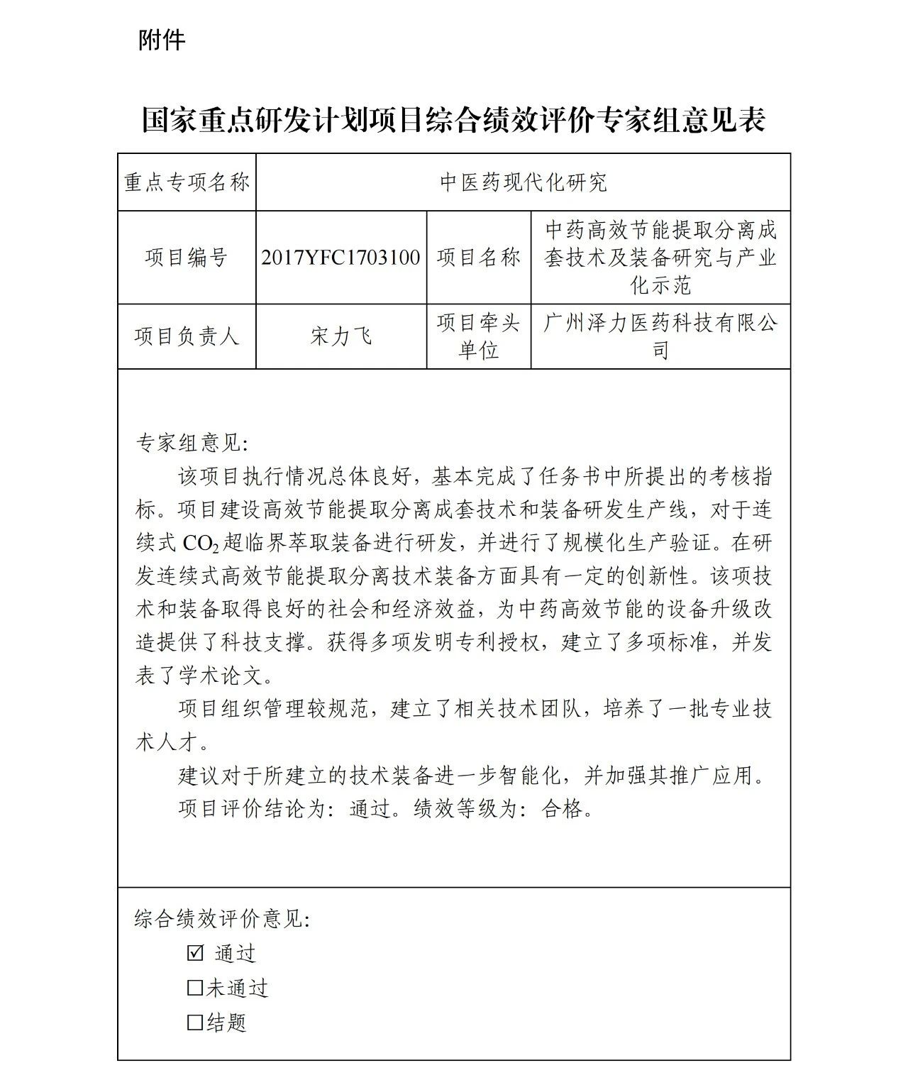 经中国生物技术发展中心组织的综合绩效评价,结论为通过,绩效等级合格。专家组意见:该项目执行情况总体良好,基本完成了任务书中所提出的考核指标。项目建设高效节能提取分离成套技术和装备研发生产线,对于连续式CO2超临界萃取装备进行研发,并进行了规模化生产验证。在研发连续式高效节能提取分离技术装备方面具有一定的创新性。该项技术和装备取得良好的社会和经济效益,为中药高效节能的设备升级改造提供了科技支撑。获得多项发明专利授权,建立了多项标准,并发表了学术论文。建议对于所建立的技术装备进一步智能化,并加强其推广应用。项目评价结论为:通过。绩效等级为:合格